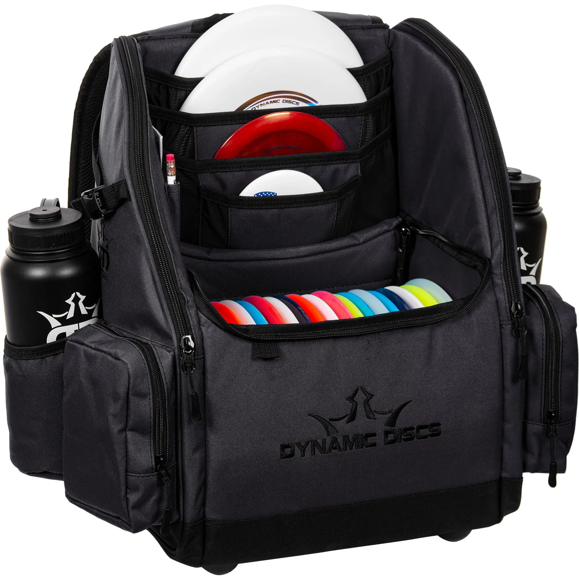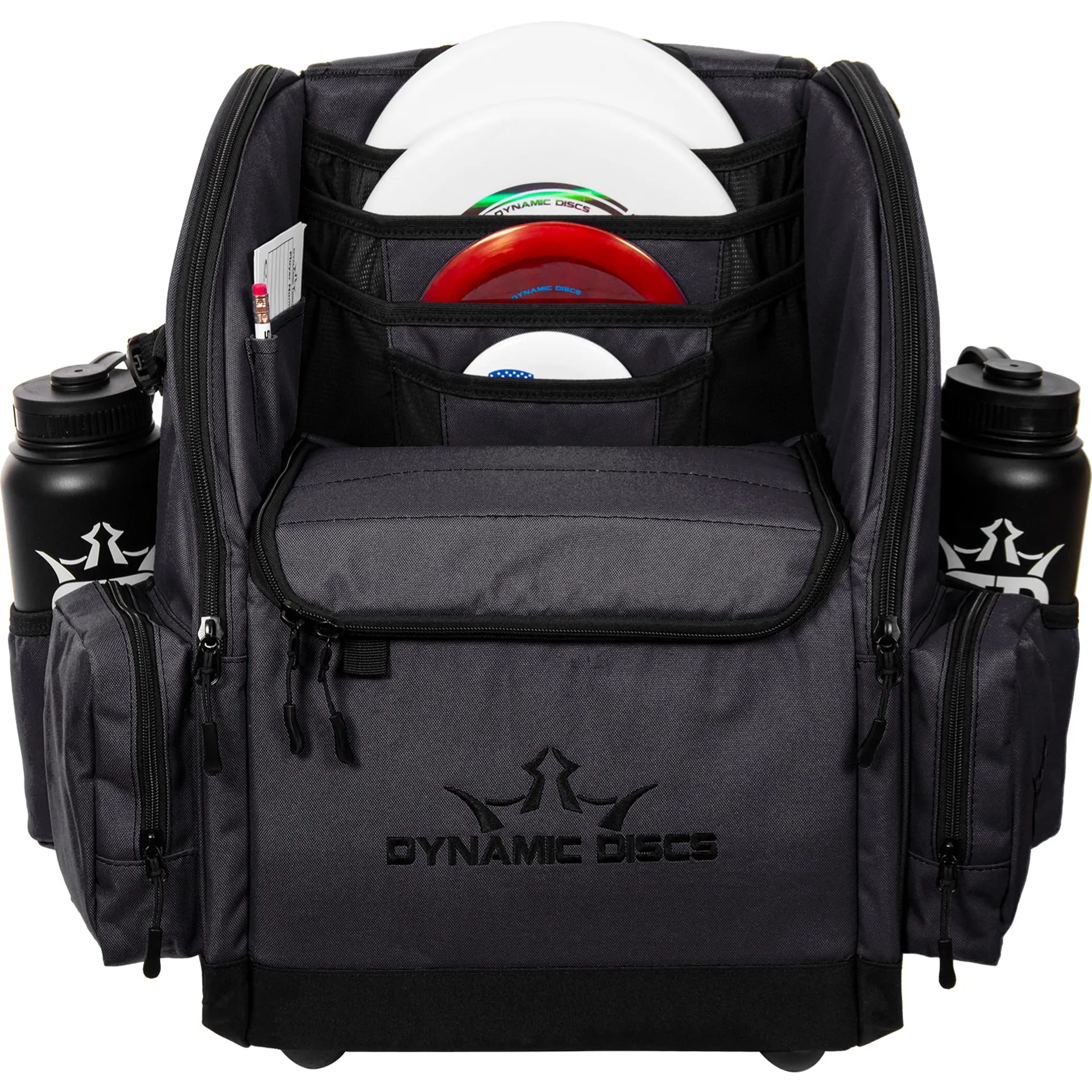 The Commander Cooler bag provides good disc storage with the added benefit of a built-in cooler. This bag can haul 10+ discs in the main compartment, 4+ discs in the vertical disc pockets, more discs or outer layers in the tall side pockets, and it still has room for a 6-pack in the insulated cooler pouch. With two additional water bottle holders on the side, the Commander Cooler ensures that you stay hydrated and have fun on the course!